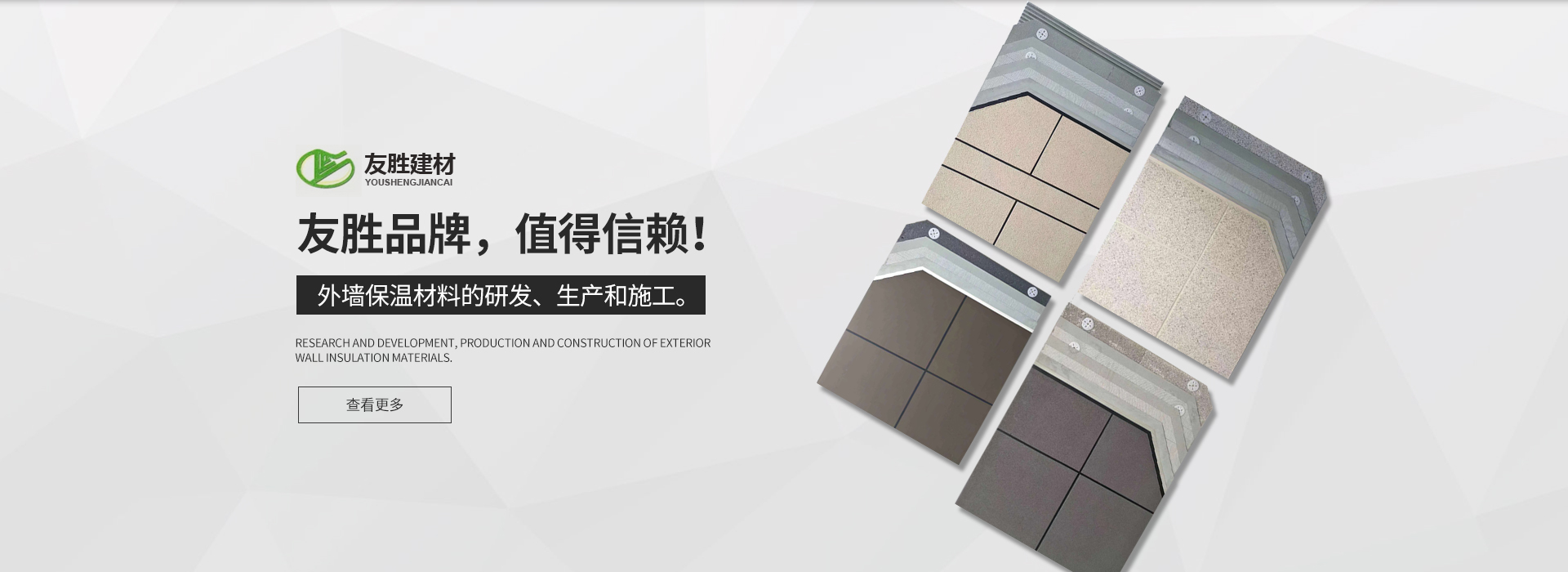 安徽友勝建材科技集團有限公司是一家專業從事建筑施工與節能保溫及裝飾裝修生產、施工企業。企業于2008年從事外墻保溫材料的研發。生產和施工。現公司旗下擁有(安徽舒然裝飾 工程有限公司)裝飾裝修貳級資質、防水防腐及保溫貳級資質。旗下系列產品有:巖棉板、巖棉復合板、石墨聚苯板、珍珠巖板、勻質板、地坪保溫隔聲板,粘結、抹面及無機輕型材料等。